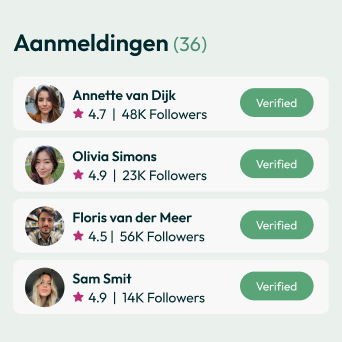 Binnen 5 minuten heb je zelf je eerste deal online staan - helemaal zonder tussenkomst van een agency. Vaak ontvang je dezelfde dag al aanmeldingen van creators die enthousiast zijn om met jouw merk samen te werken.